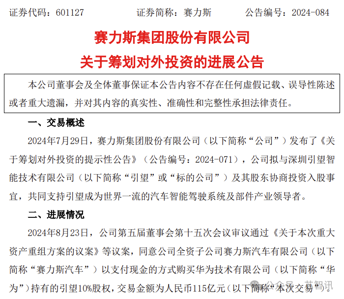8月25日下午,赛力斯集团股份有限公司(以下简称“赛力斯”)发布关于筹划对外投资的进展公告,宣布已于8月23日与华为、引望签署了附条件生效的《股权转让协议》,约定赛力斯汽车购买华为持有的引望10%股权,同时赛力斯汽车与华为、引望签署 《关于加入<关于深圳引望智能技术有限公司之股东协议>之协议》,交易金额为人民币115亿元。