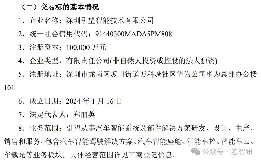 根据公告及工商资料显示,引望智能是华为100%控股的全资子公司,成立于2024年1月16日,注册资本10亿元,主要从事汽车智能系统及部件解决方案研发、设计、生产、销售和服务,主要业务范围包括汽车智能驾驶解决方案、汽车智能座舱、智能车控、智能车云、车载光等。